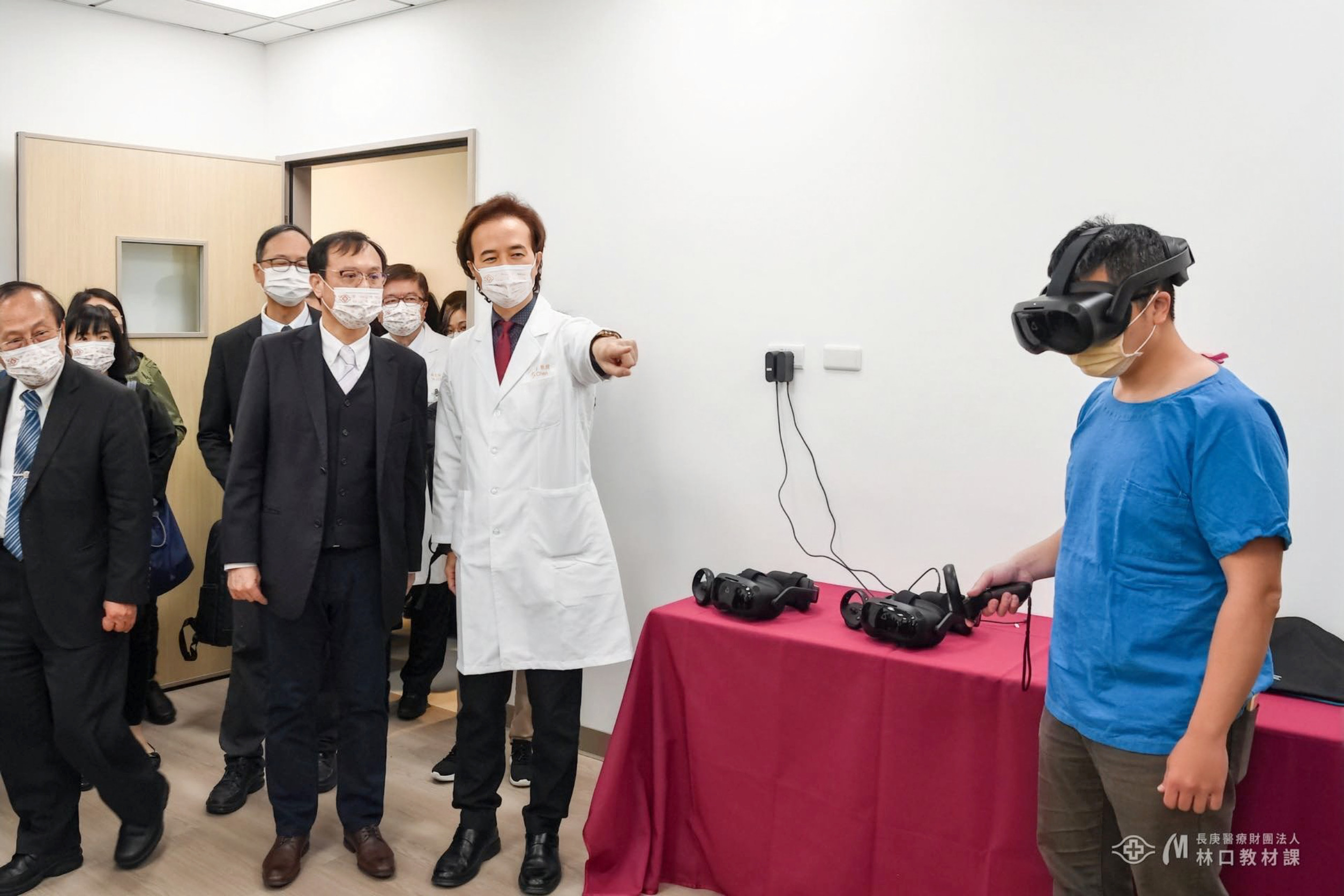 中心啟用典禮當日,國眾電腦王超群董事長與現場貴賓展示與長庚醫院醫療共同開發與導入使用的『VR 360手術影片教案客製化製作 』。(長庚醫院/提供)