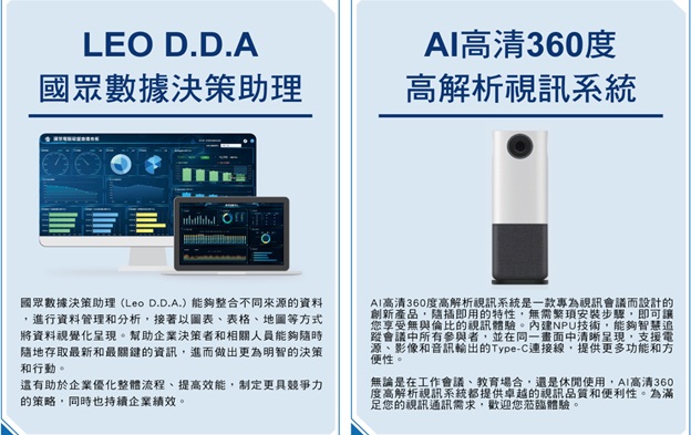 『國眾數據決策助理 LEO D.D.A』將重要的碳盤查指標數據透過系統可視化呈現與『AI高清360度高解析視訊系統』展出,國眾電腦提供。